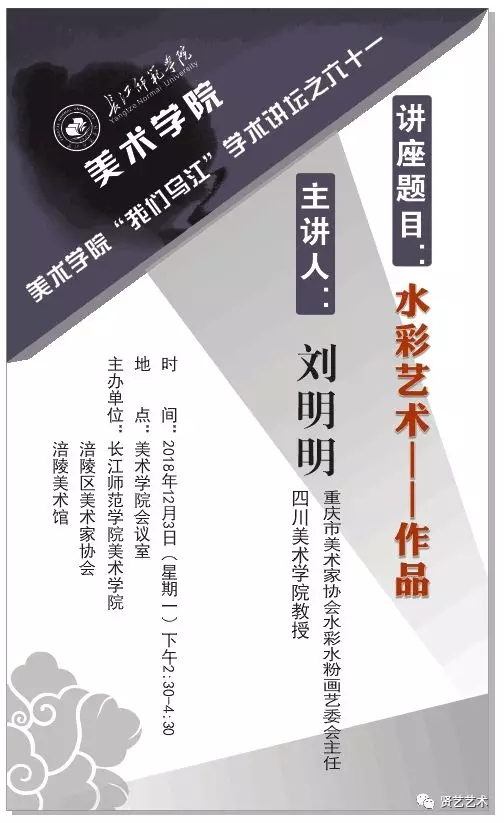 下午两点半,重庆市美协水彩、粉画艺委会主任、四川美术学院刘明明教授举办了《水彩艺术---作品》学术讲座。刘明明教授以其扎实的艺术功底、严谨的学术态度为我们进行了一场精彩生动的学术讲座,使各位师生受益匪浅。