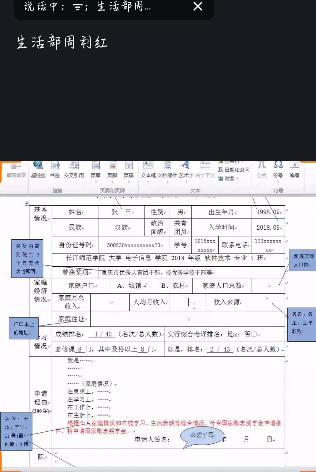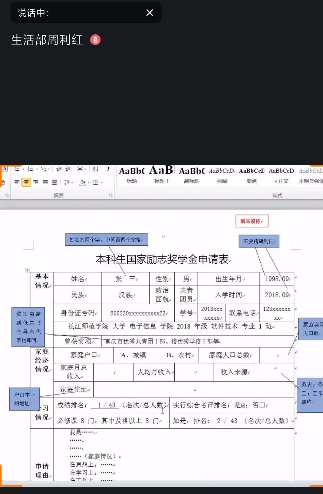 随后解读了国家助学金的相关填写方式和要求,与国家励志奖学金的要求大部分重合。但是对家庭经济情况做出了特别要求,必须是家庭经济特别困难,生活俭朴的同学才能申请。