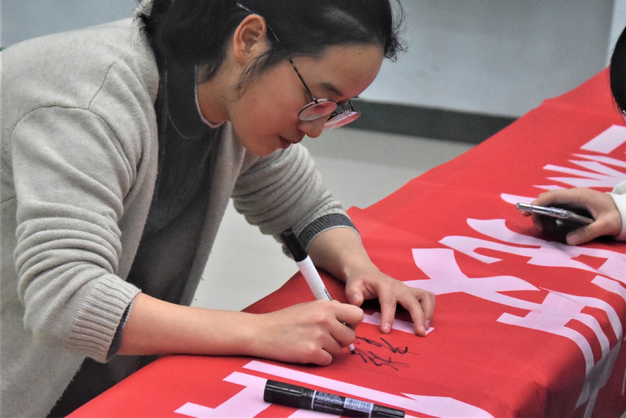 接着,袁老师列举了生活中的浪费现象,并向同学们提问生活中的节约小窍门,现场气氛活跃,同学们分享了不少节约小妙招。随后,袁老师提到习近平总书记的重要讲话,并为同学们播放了一首公益歌曲谁知盘中餐”,倡导同学们要从自身做起,倡节约之风,积极参与光盘行动。活动最后同学们共同宣誓,袁老师带头在横幅上签名,同学们依次在横幅上签字,作出了自我承诺。