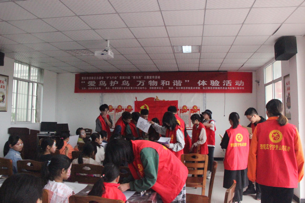 为了普及鸟类知识、增强护鸟意识,推动护鸟工作的开展,美术学院志愿者与麦田社工、现代农业与生物工程学院志愿者在424日在石龙社区参加了“护飞行动”暨第二十五届“爱鸟周”主题宣传活动。此次活动主题为“爱鸟护鸟,万物和谐”,由涪陵区林业局主办,李渡街道石龙社区青少年活动中心承办,活动对象为石龙社区的30名儿童。