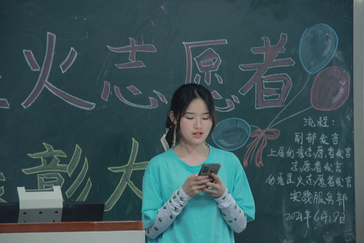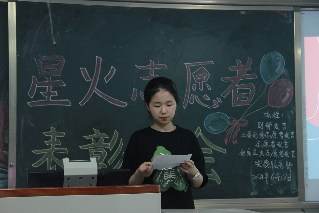 在他们分享过后,大家收看了上届学长学姐们的视频,每个人都在星火志愿者的实践活动中有了许多的感悟,留下了深刻的回忆。接下来由各位优秀志愿者依次上台发表自己的感受,朴实的话语包含了这一年来的真情实感。