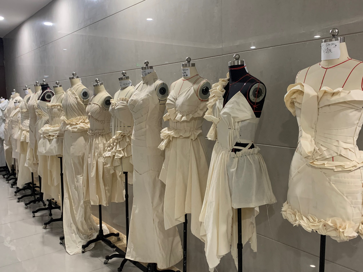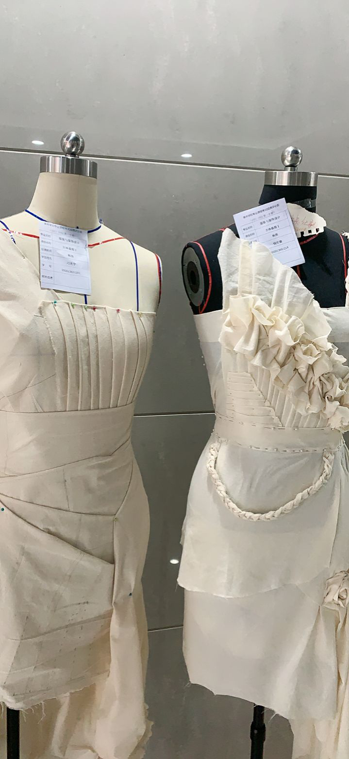 《立体裁剪I》是立体裁剪的基础阶段。前期课程是《构成基础》和《服装设计基础》学生还不具备丰富的服装相关的知识。不过好在同学们比较喜欢动手操作。主要让学生了解服装立体造型的基本理论,认识服装与人体的关系,明确服装立体裁剪的规范流程;重点学习和掌握服装原型的制作原理,省道转移的原理,各种领形、袖型、裙形的立体裁剪原理。难点是对放松量的把握,尤其是较为贴体的服装,既能体现人体线条美,又能保持人体的呼吸量。学生在制作过程中,容易忽略这一点,一不小心就把衣片死死钉在人体台上。