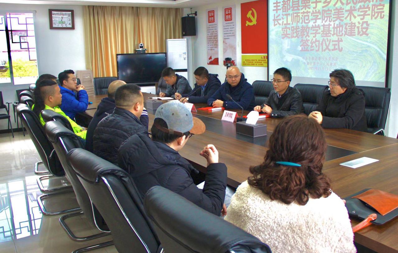 为在校学生搭建参与社会实践的基础平台,促进美术专业理论与社会实践的紧密结合,锻炼和提高学生的市场知识运用和适应社会的能力,培养和树立其正确的人生观、价值观和择业观,增强学生毕业后应聘就业的竞争力,为国家和社会培养合格的优秀人才,为打造“人文栗子”“美丽栗子”贡献力量。2021年11月20日,长江师范学院美术学院院长傅小彪带队前往丰都县栗子乡举办校企共建实践教学基地签约仪式,栗子乡副乡长杨磊、组织委员、宣传委员等出席签约仪式。