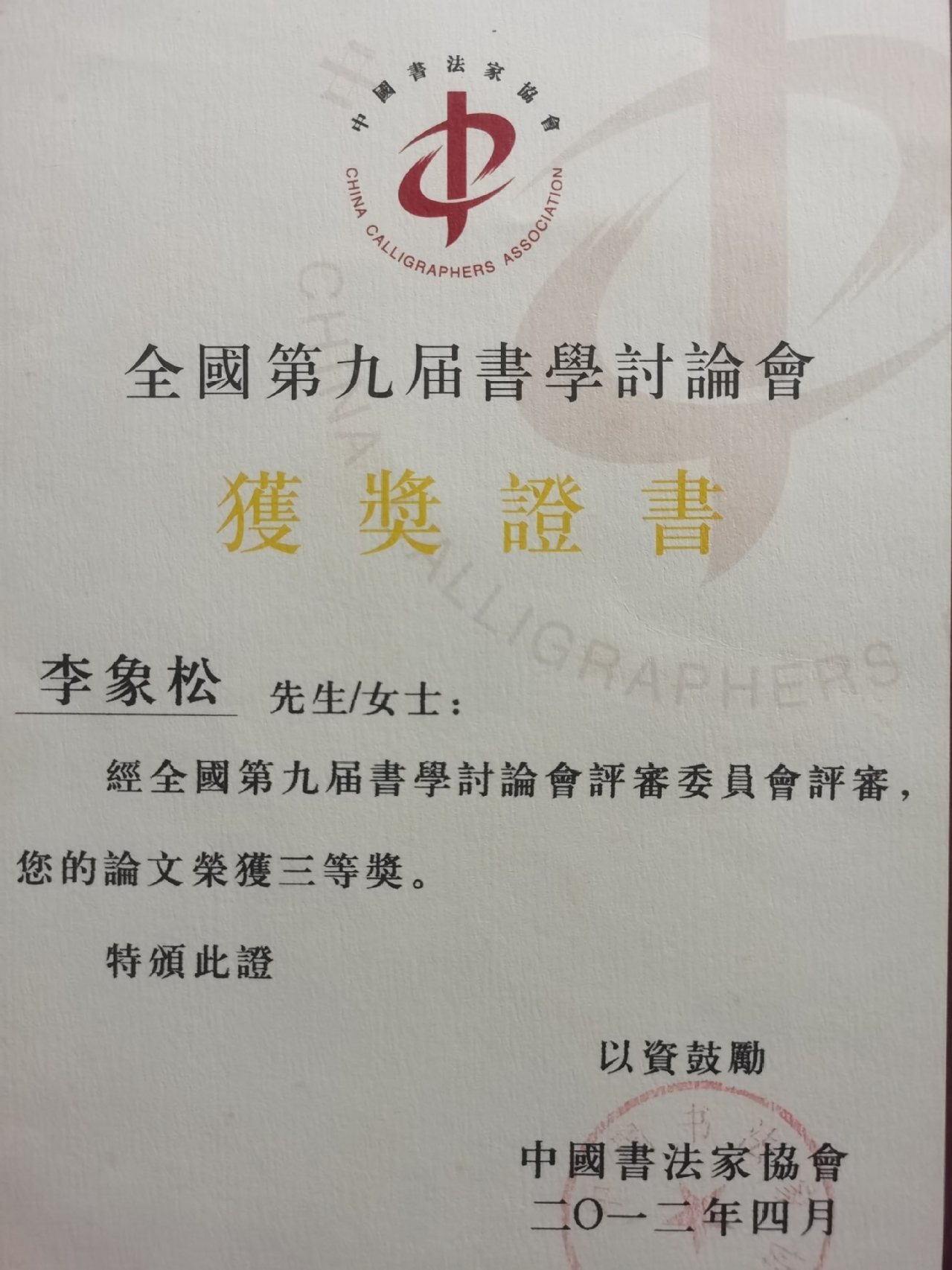 李象松老师 获奖证书