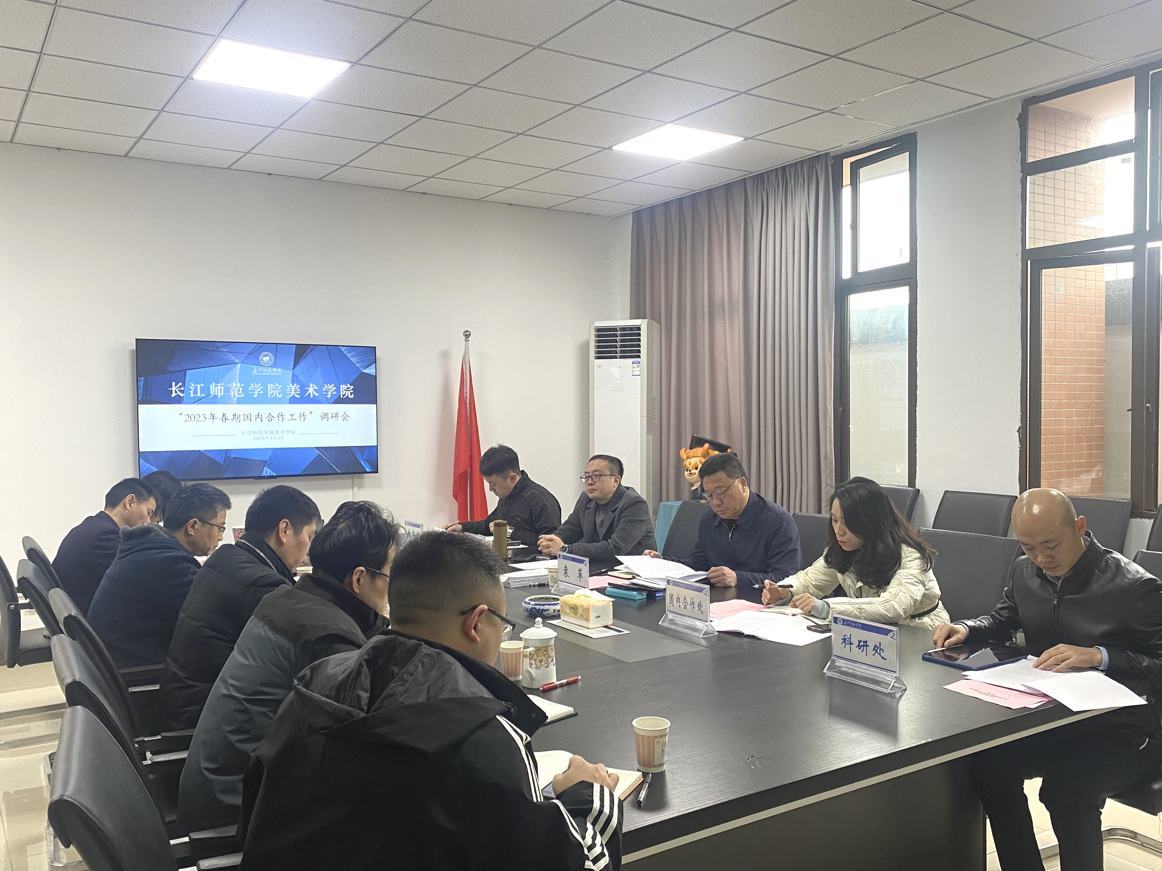 为了更好的谋划在新时期新发展阶段的国内合作工作,深入了解学院国内作推进情况,持续深化校地合作,助推区域经济社会发展;同时提升我院学科科研、专业建设以及高质量人才培养实效。根据学校的安排,2023年3月2日上午9:00,由学校党委常委、副校长袁革带队一行到美术学院开展“2023年春期国内合作工作调研会”,出席会议的有学校党委常委、副校长袁革、学校国内合作处处长谢艳、招就处副处长蓝孝帅、教务处副处长徐宏凯、科研处副处长李言栋、美术学院院长傅小彪、党委书记董顺伟、副院长闫翀、办公室负责人熊洁、实训中心主任刘金宝、团委副书记洪孝兵。会议由国内合作处处长谢艳主持。