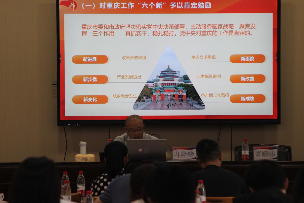 其次,冉校长重点解读了习近平总书记听取重庆市委和市政府工作汇报后的重要讲话精神。他讲到这部分内容对于我们了解总书记对重庆工作的肯定、对重庆未来发展的期望以及对党员干部的嘱托具有重要意义。通过学习这些讲话精神,我们可以更加清晰地认识到重庆在全国大局中的重要地位和作用以及我们自身肩负的责任和使命。