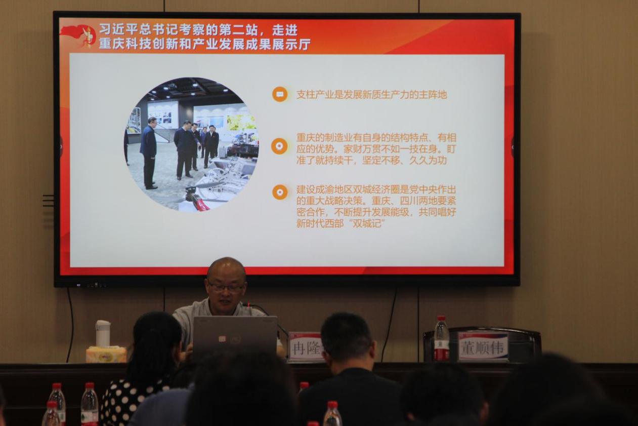 首先,冉校长详细阐述了习近平总书记重庆行概况及重要指示精神。通过对习近平总书记在重庆的具体行程和活动内容的讲解,让在场的全体党员同志对习近平总书记重庆视察情况有了全面且深入的理解。冉校长的讲述让我们更加清晰地认识到,总书记此次重庆之行并非一次简单的考察,而是一次具有深远战略意义的视察和指导,为重庆未来的发展规划指明了方向。