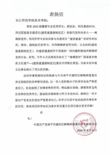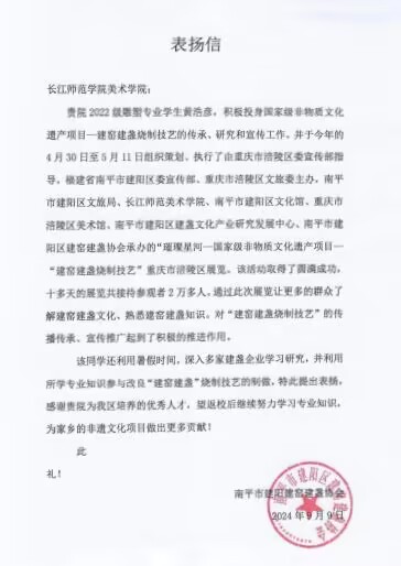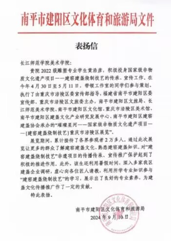今年4 月30日至5月11日,我院2022级雕塑1班黄浩彦带领工作室的同学们参与策划、执行了由重庆市涪陵区委宣传部指导,福建省南平市建阳区委宣传部、重庆市涪陵区文旅委主办,南平市建阳区文旅局、长江师范美术学院、南平市建阳区文化馆、重庆市涪陵区美术馆、南平市建阳区建盏文化产业研究发展中心、南平市建阳区建窑建盏协会承办的“ 璀璨星河 一 一 国 家级非物质文化遗产项目 一 一{建窑建盏烧制技艺}重庆市涪陵区展览”。此次展览圆满成功,不仅吸引了众多建盏爱好者和收藏家的关注,更因其精心的策划与出色的执行而广受好评。其中,策划执行团队的核心成员黄浩彦同学因其在展会中的卓越表现,荣获了南平市建阳区文旅局,南平市建窑建盏协会,中国共产党南平市建阳区阙梅娇建盏传承支部委员会特别颁发的表扬信。