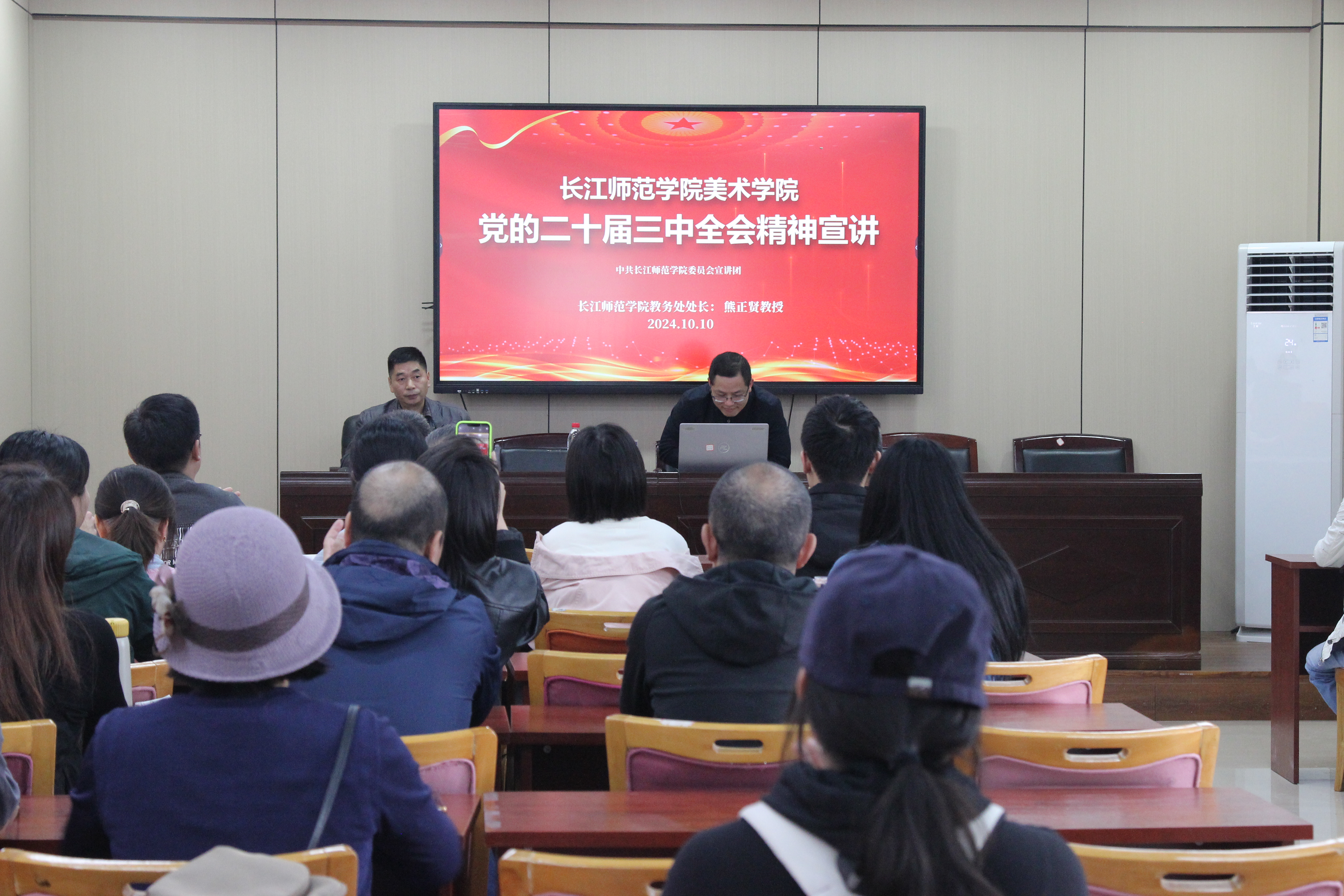 根据学校党委“学习贯彻党的二十届三中全会精神”宣讲工作安排,2024年10月10日下午长江师范学院党委委员、教务处处长熊正贤教授莅临美术学院宣讲,宣讲会由美术学院党委书记董顺伟同志主持,全体教职员工参会。