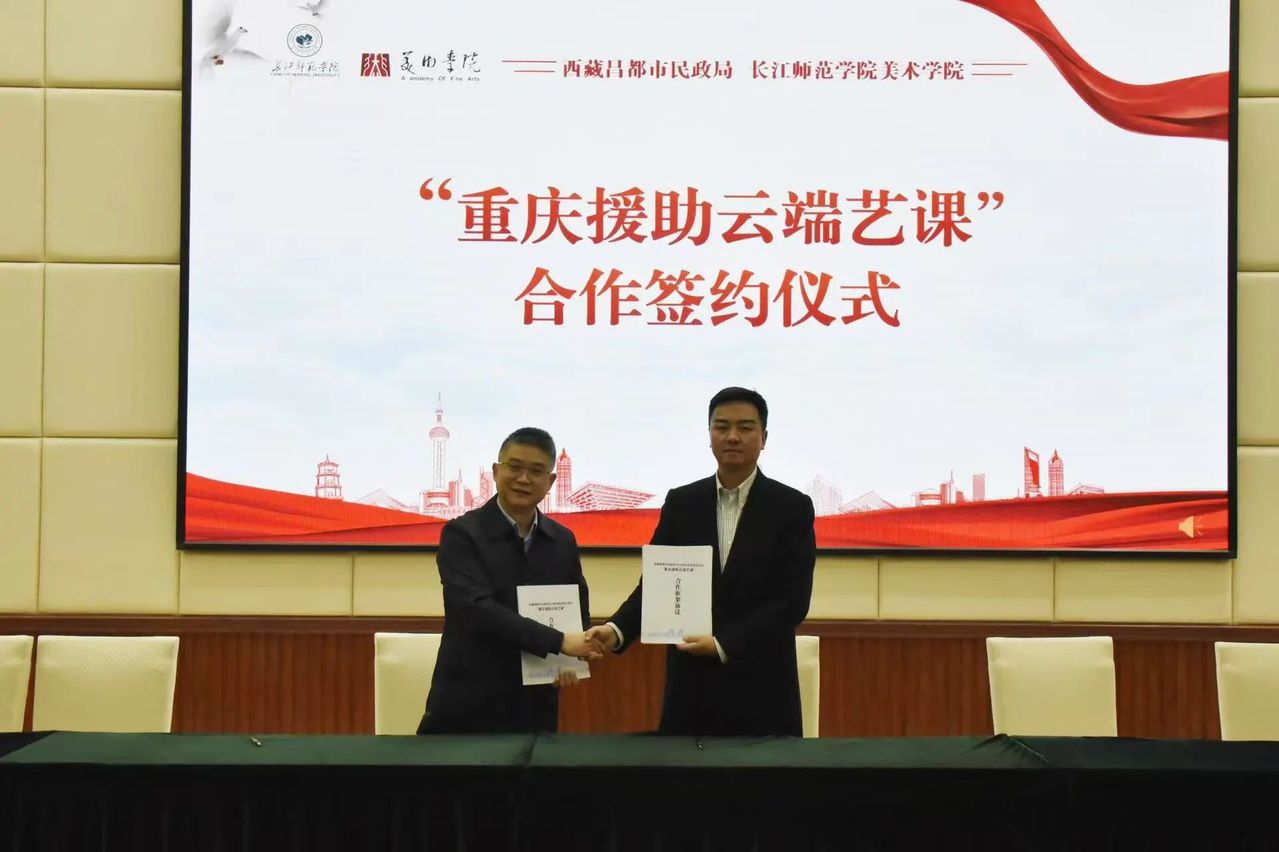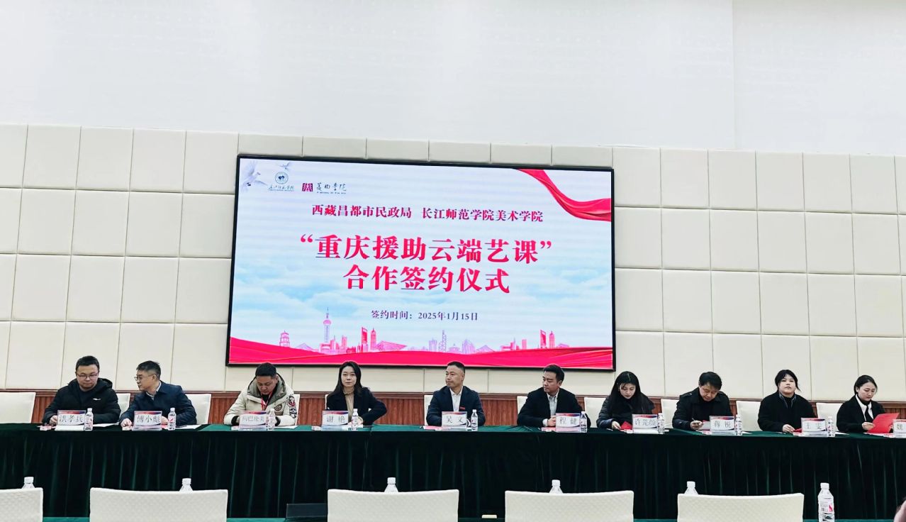为深入贯彻落实习近平新时代中国特色社会主义思想,党的二十大和二十届三中全会精神,坚持铸牢中华民族共同体意识主线和新时代党的治藏方略,深入落实第四次对口支援西藏工作会议部署,西藏昌都市民政局一行到重庆开展为期 15 天的 “三交” (交往、交流、交融)活动。2025 年 1 月 15 日上午,在致远楼 101 会议室隆重举行西藏昌都市民政局与长江师范学院美术学院 “重庆援助云端艺课”合作签约仪式。本次签约仪式由长江师范学院美术学院党委书记董顺伟主持,重庆市民政局处长(支援昌都民政局党组副书记、副局长)程健、西藏昌都市民政局救助科主任向巴伦美以及昌都市福利一院、二院、特殊教育学校师生和工作人员;长江师范学院党委常委、副校长吴文、国内合作处处长谢艳、美术学院院长傅小彪、团委副书记许芫颜、重庆白鹤梁水下博物馆馆长蒋锐及“云端艺课”师生志愿者代表等出席并见证了本次签约仪式。