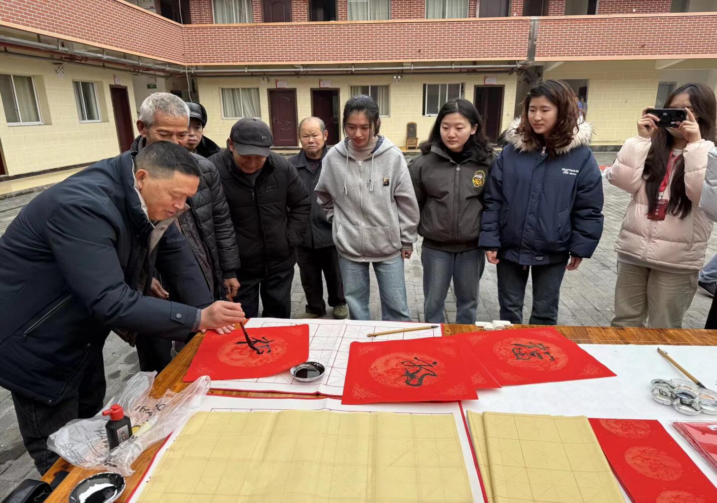 福字创作完成后,师生代表将提前精心书写的春联、现场创作的福字逐一赠送给老人们,并与老人们亲切合影留念,定格温暖瞬间。随后,同学们纷纷拿出提前精心制作的手绘贺卡,向老人们表达真挚的新年祝福,一句句暖心问候、一张张特色贺卡,让养老公寓充满了浓浓的温情。