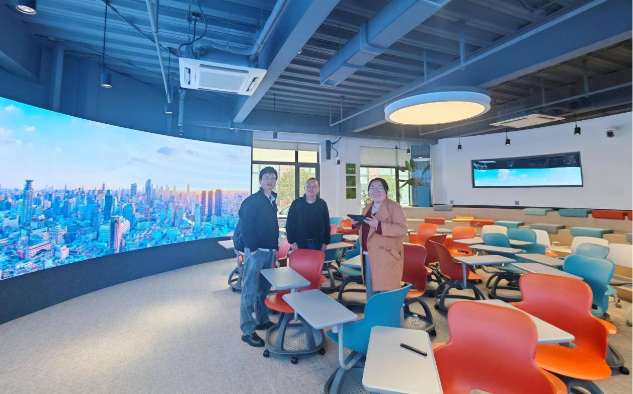 在上海财经大学科创学院,实地参观智慧演播室,详细了解人工智能技术在数字媒体艺术教学、智慧教学场景搭建、跨学科艺术实践中的应用案例,学习数字化教学空间建设与运维经验,探索AI技术与美术设计、美育实践结合的落地路径。
