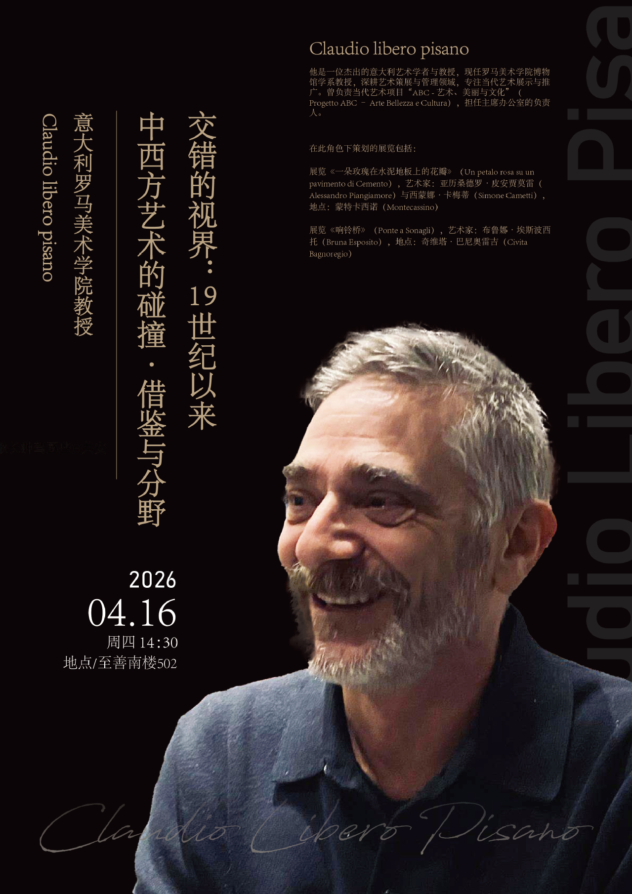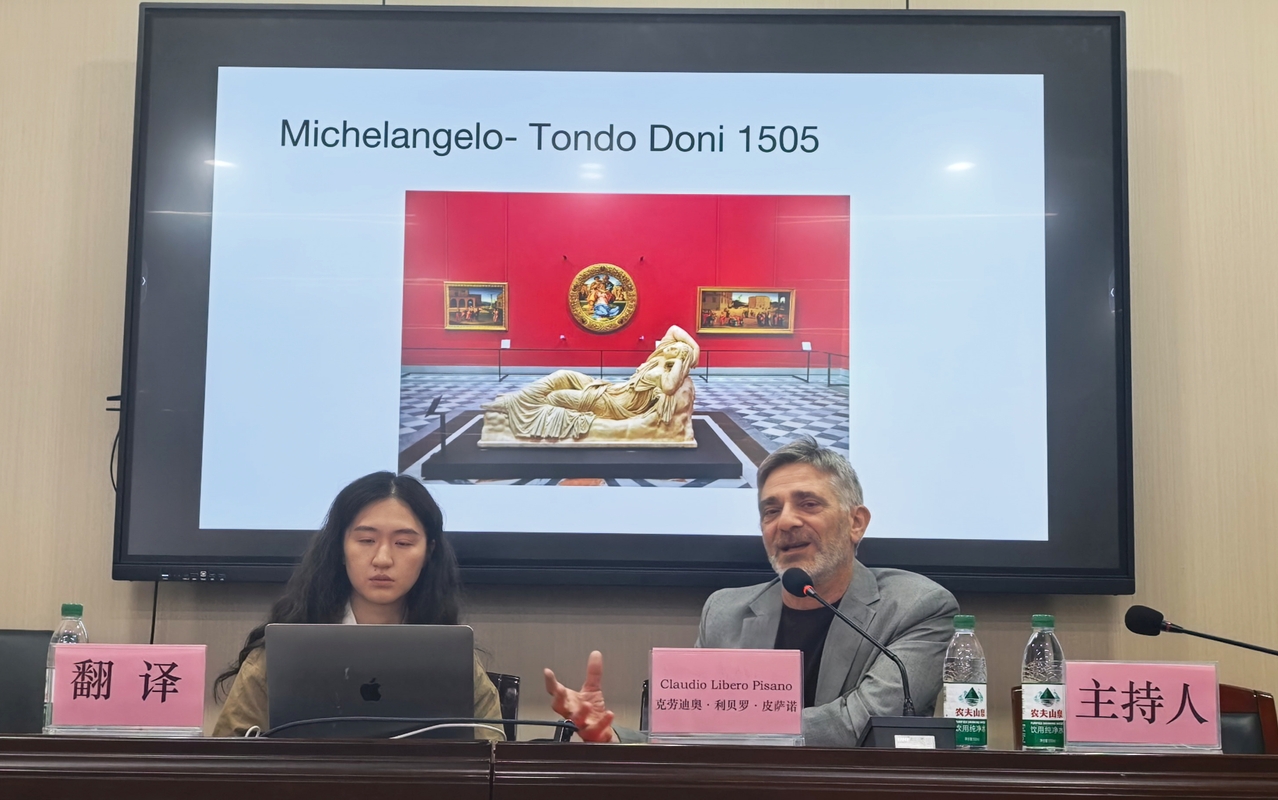 4 月 16 日下午,由我院主办的“美术学院国际工作坊——大师课”系列讲座之“从沙龙到白盒子:博物馆身份的世纪之变”主题讲座,在至善楼南502 圆满举行。意大利杰出艺术学者、罗马美术学院博物馆学系教授克劳迪奥・利贝罗・皮萨诺(Claudio Libero Pisano)受邀担任主讲人,学院相关师生参与此次学术活动。