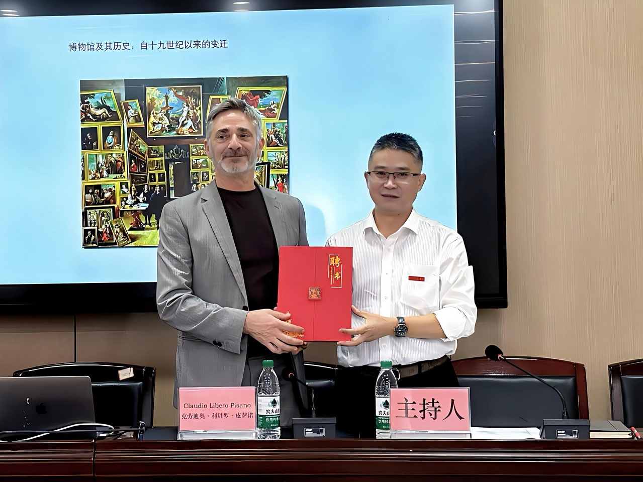 学院党委书记傅小彪主持讲座并为皮萨诺教授颁发了工作坊客座教授聘书,对其莅临学院开展学术分享表示热烈欢迎与诚挚感谢。作为深耕艺术史、博物馆学、艺术策展与管理领域的资深学者,皮萨诺教授拥有广阔的学术视野与丰富的实践经验,曾担任当代艺术项目“ABC - 艺术、美丽与文化”主席办公室负责人,在相关领域成果丰硕。